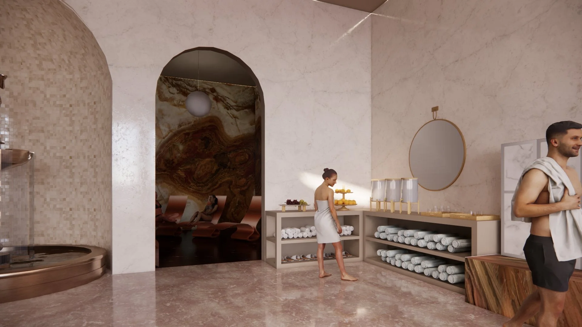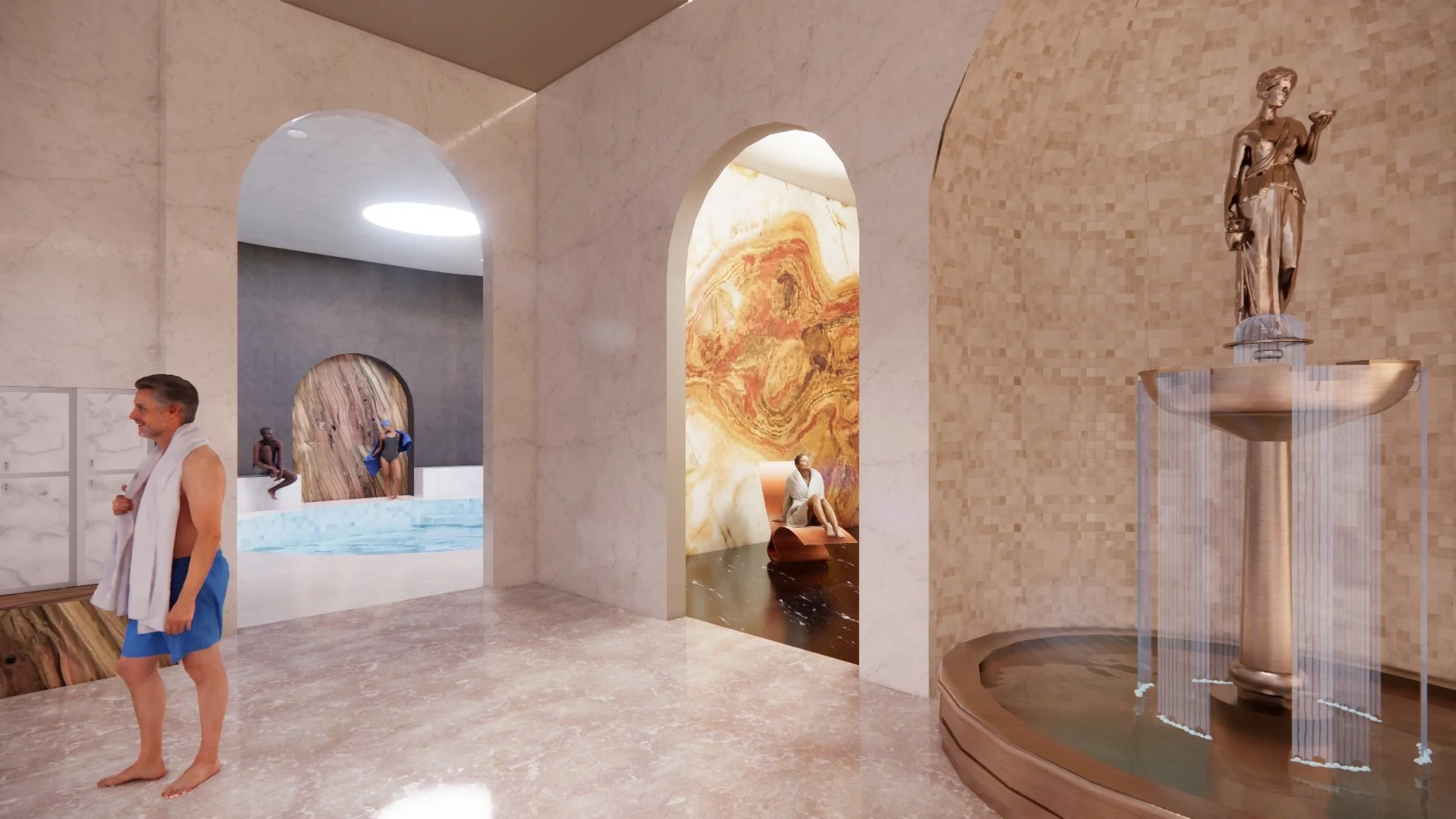 Roman baths were a significant part of the social lives of ancient Romans, serving as places for daily hygiene and as hubs for community and relaxation. A bath house could host a variety of amenities, but the three most common areas were the caldarium, frigidarium, and tepidarium. The caldarium had intense heat and steam, the frigidarium offered benches and a cold plunge, and the tepidarium served as a warm resting area between the two spaces. Inspired by this classical layout and other traditional Roman architectural details, I designed a modern day spa that blends ancient Roman practices with contemporary design.